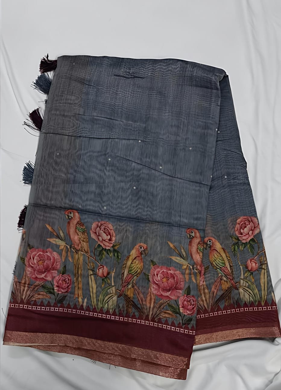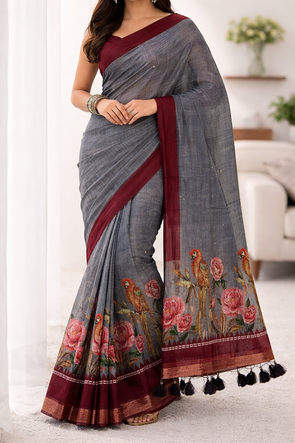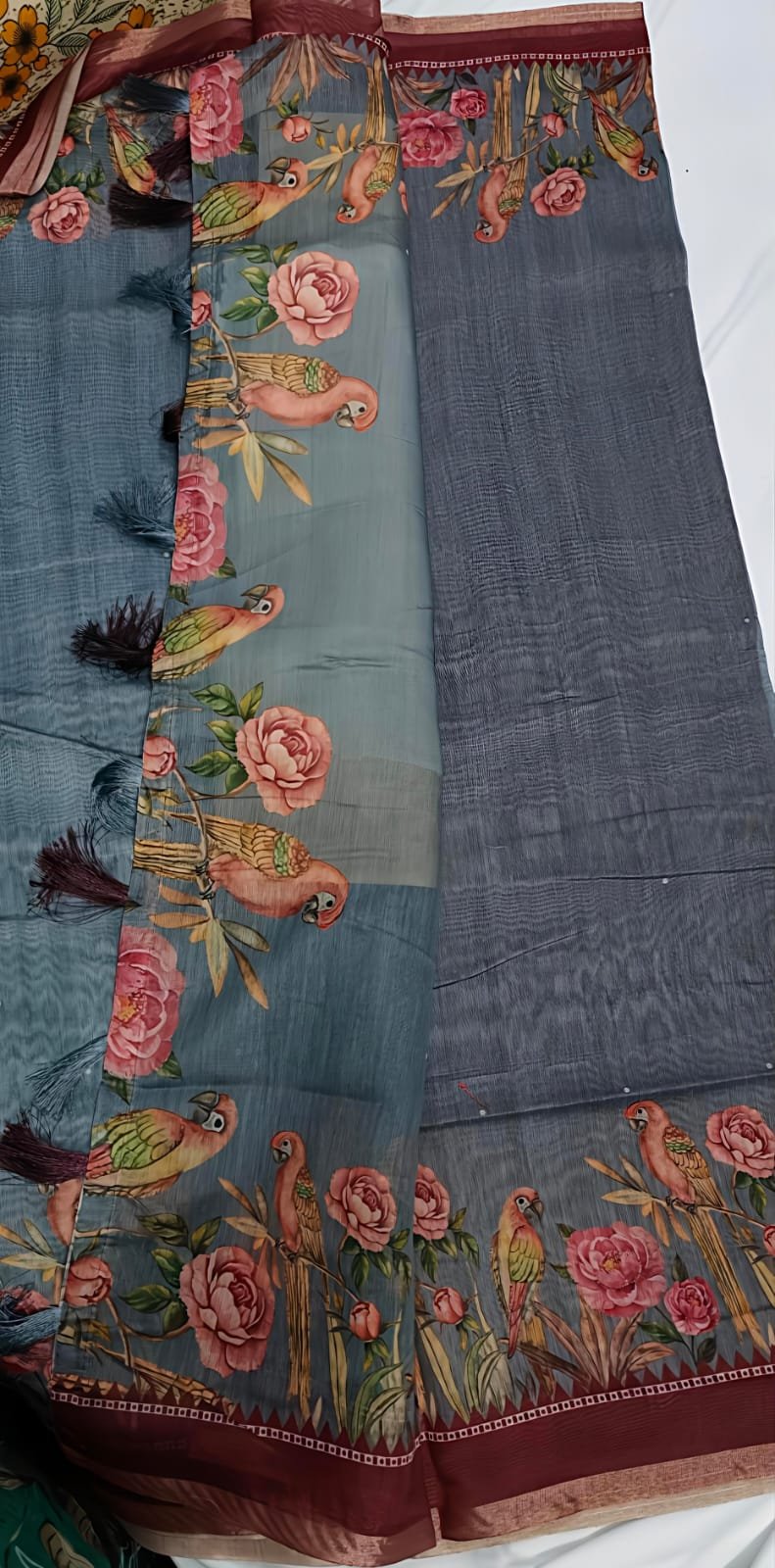 Charming parrot motifs with a vibrant touch make this saree a perfect choice for a fresh, playful, and elegant ethnic look.