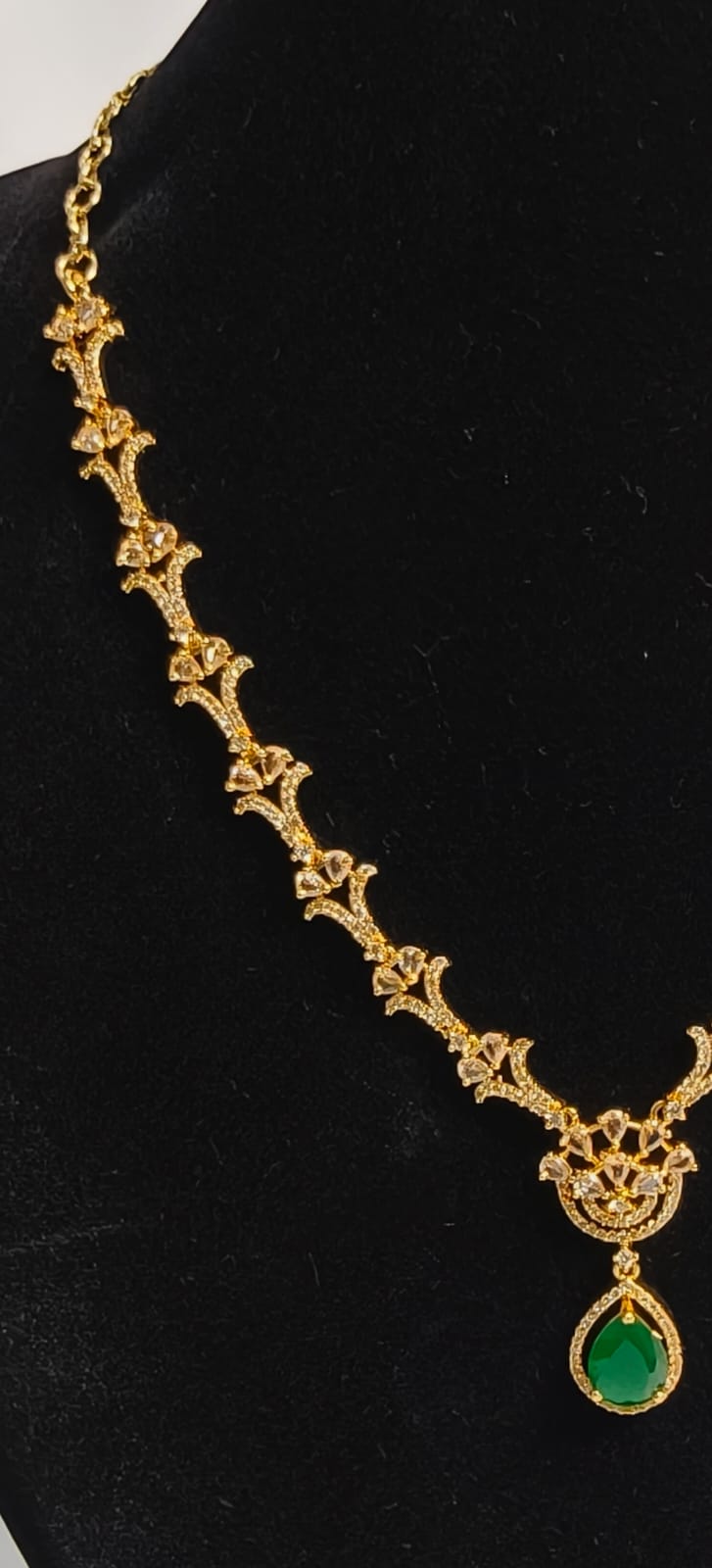 Elegant gold-toned necklace featuring sparkling white American Diamond (AD) stones in intricate floral patterns, accented by a vibrant green emerald drop pendant for a touch of luxury.