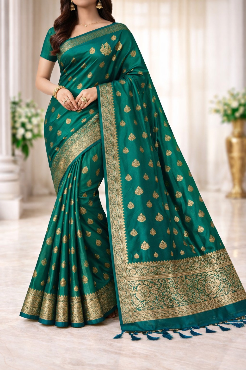Luxuriously crafted Banarasi silk with traditional zari weaving for a royal and graceful look.