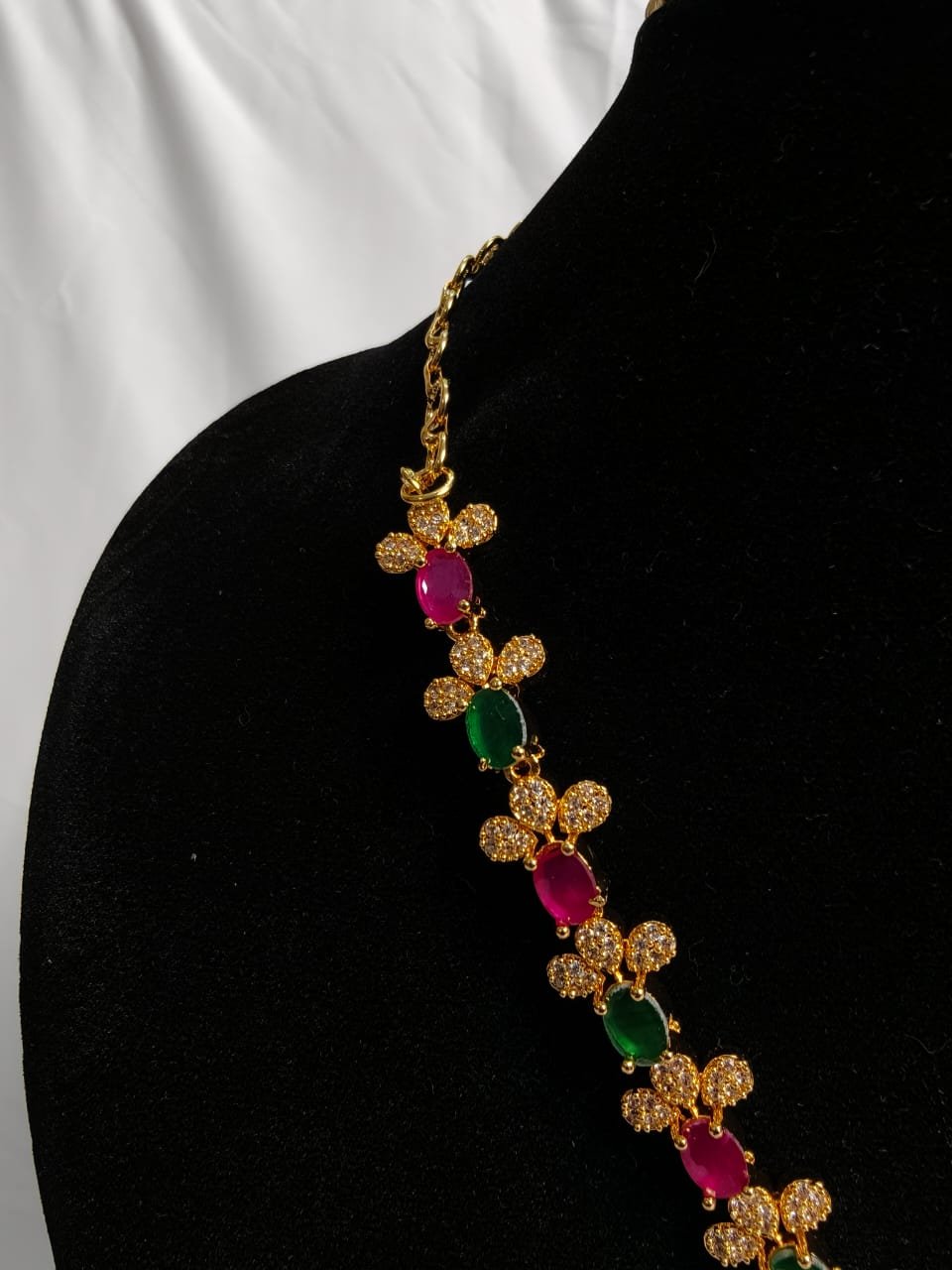 This exquisite AD stone piece boasts delicate floral links with clear white cz diamonds and a central emerald pendant, ideal for adding sophistication to ethnic or bridal wear.