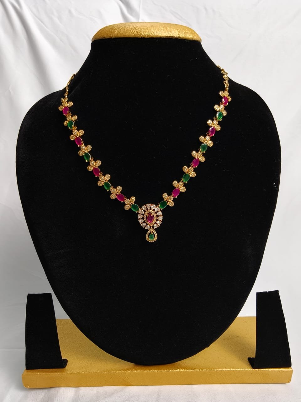 Beautiful floral-design necklace adorned with ruby-pink and emerald-green stones for a rich traditional look.