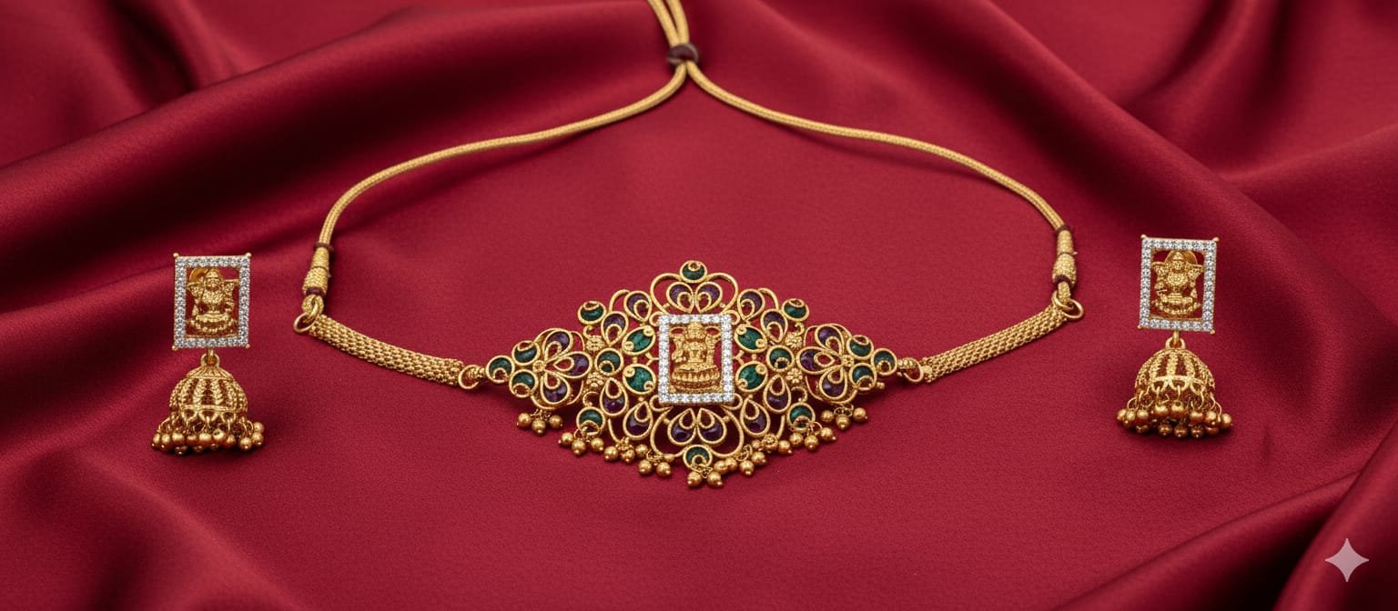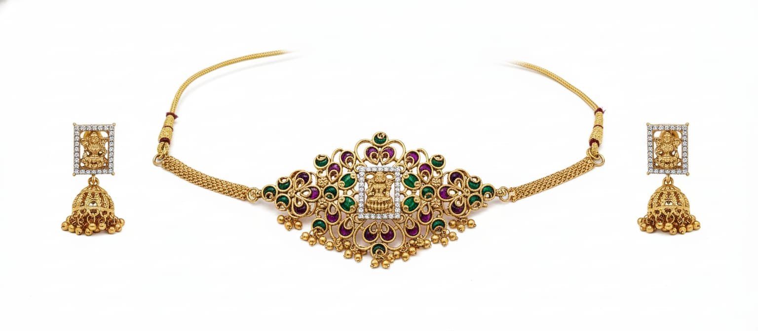 Temple-Inspired Gold Choker Set With Intricate Lakshmi Motif & Jhumka Earrings
