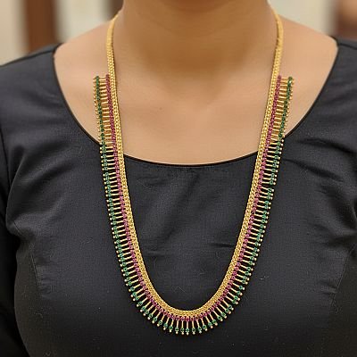 Beautiful floral-design necklace adorned with ruby-pink and emerald-green stones for a rich traditional look.