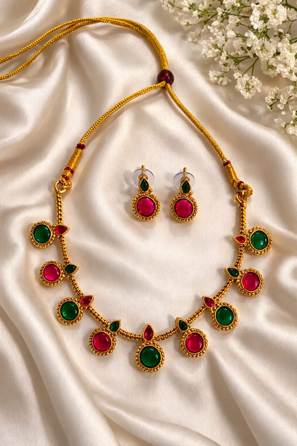 nhance your ethnic look with this beautifully crafted choker-style necklace set, featuring intricate traditional motifs adorned with vibrant red and green stones. Designed to rest elegantly along the neckline, it offers a perfect blend of classic charm and refined sophistication. Lightweight and comfortable to wear, this timeless piece is ideal for weddings, festive occasions, and cultural celebrations.
