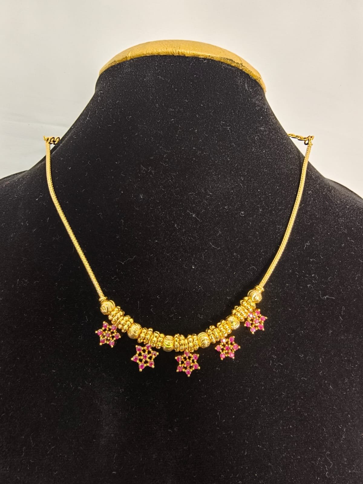 Beautiful floral-design necklace adorned with ruby-pink and emerald-green stones for a rich traditional look.